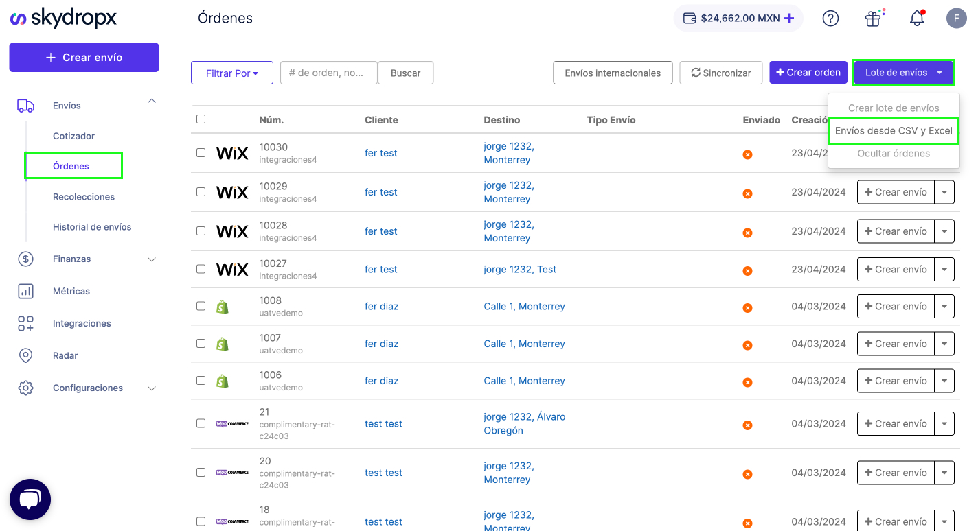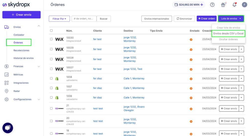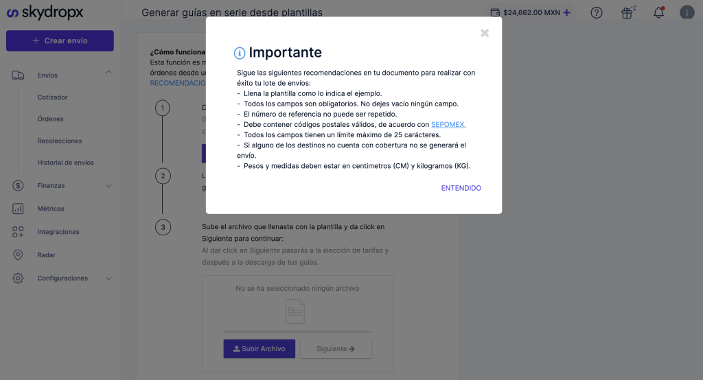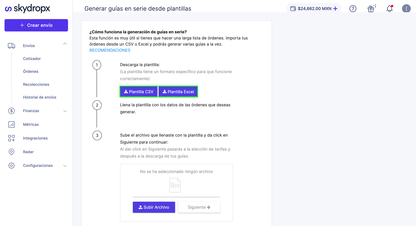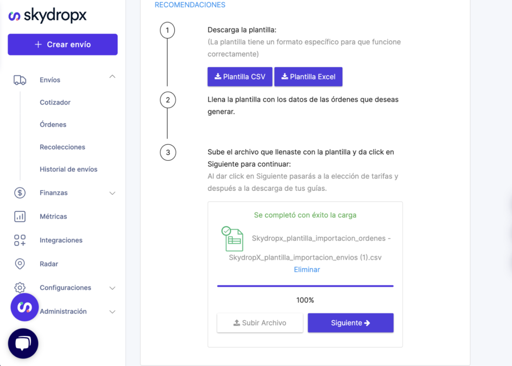 1. Descarga la plantilla desde la plataforma en «Órdenes» > «Lote de envíos» > «Envíos desde CSV y Excel».