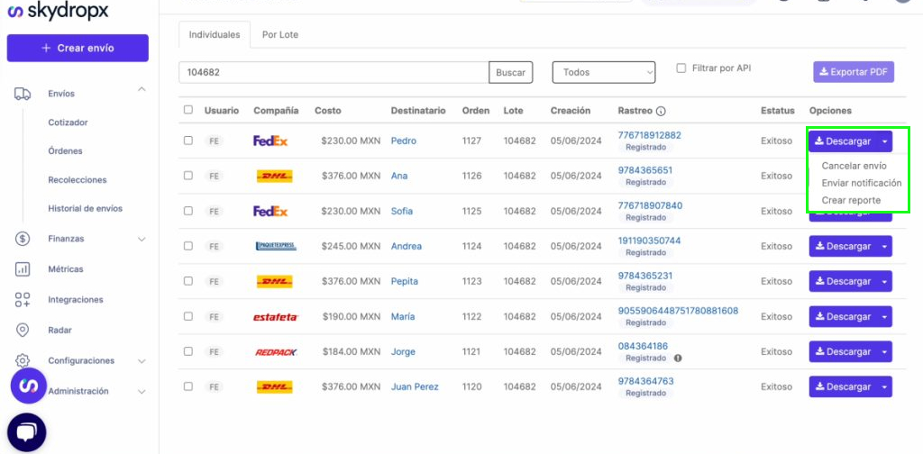 9. En «Individuales» puedes descargar la guía, cancelar el envío, enviar notificación o crear un reporte, envío por envío, haciendo clic en el botón de “Descargar”.