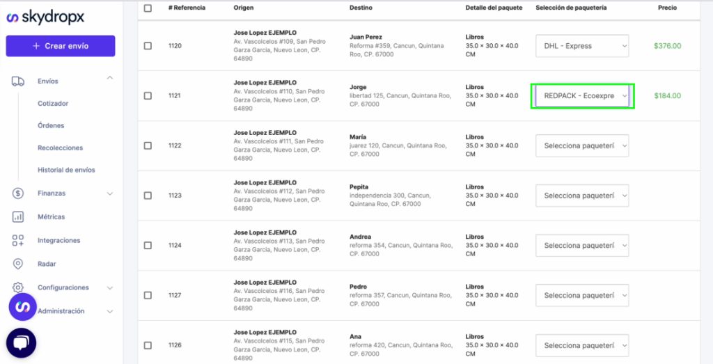 6. Elige la misma paquetería o una diferente para cada una de tus órdenes. Ten en cuenta que el precio varía entre cada paquetería.