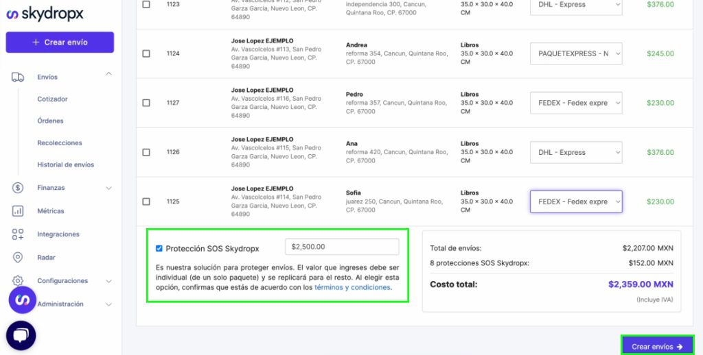 7. Ingresa el valor de la Protección que aplicarás a tus envíos. Este valor corresponde a un solo paquete y se replicará en el resto. Luego haz clic en «Crear envío».